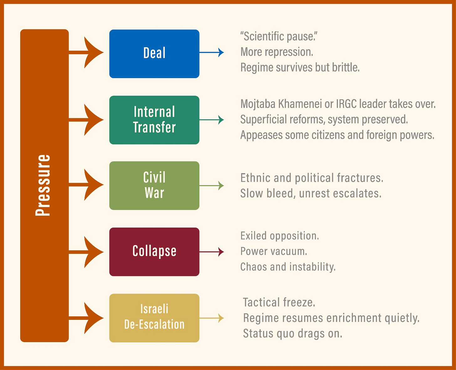 From strategic retreat to regime collapse, the Islamic Republic's volatile trajectory could reshape U.S. policy, Israeli defense strategy, and regional power dynamics