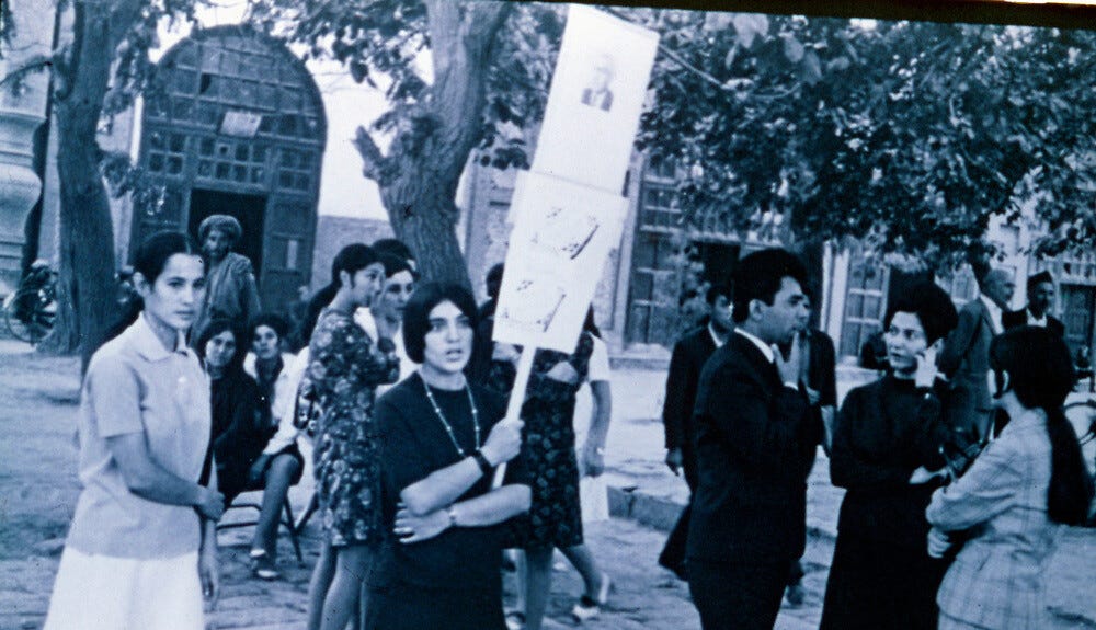 Few Afghans would recognize their country in Osman Hamdard's photographs. They show women at a political demonstration in Kabul, chatting freely with men in a public square. In the foreground, one woman holds up a placard while others mill around behind her, several dressed in skirts. In 1970, when the picture was taken, this scene was normal, but today these women would be breaking Afghan law for failing to observe strict dress codes and appearing in public without a male escort.