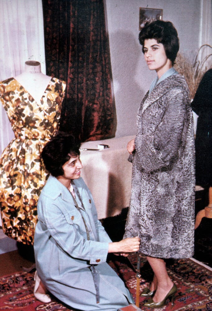 The photographs are an essential part of this project. Alongside the images of everyday life are snapshots of historic sites, including the famous Buddhas of Bamiyan, which the Taliban destroyed in 2001. There are black-and-white pictures of royal rulers, including Khairya, the daughter of Mahmud Tarzi, who set the trend in wedding dresses with her European-style bridal gown worn at her wedding in 1909. A later picture in color shows a seamstress fitting a female customer in the 1960s, both women sporting fashionable hairstyles and well-cut coats.