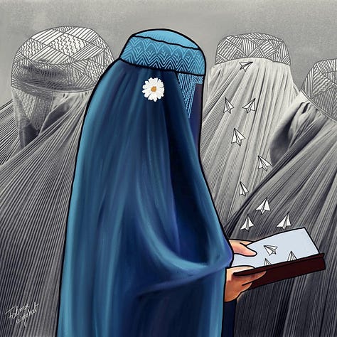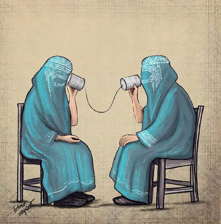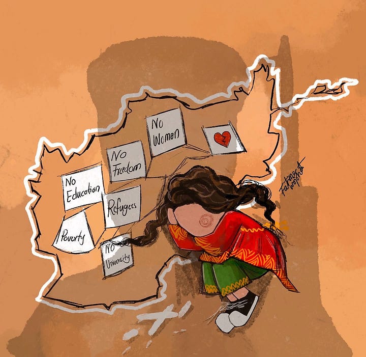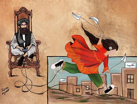 After witnessing the Taliban’s brutality and their oppression of women in Afghanistan, Fatima decided to push back and resist, starting with the Taliban’s supreme leader. “I learned how to do digital art on my phone and started drawing with my fingertips,” she added, “I used to publish on Instagram, and then delete everything and turn off my location because I would get death threats from the Taliban telling me that they are going to find me.” For 3 years under Taliban rule, Fatima courageously drew, sketched, and painted the Taliban’s supreme leader, their draconian laws, abuses, and human rights violations in the context of caricatures and political art. She grew her Instagram following from a few supporters to thousands, even attracting the attention of diaspora media such as Afghanistan International.