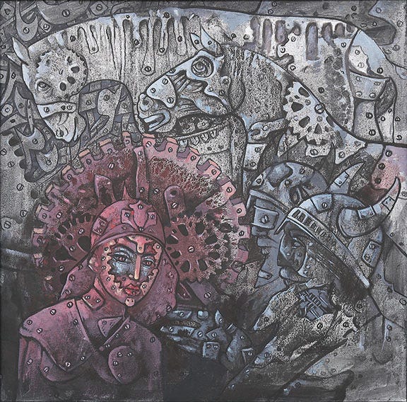 His award-winning piece “The Motherland” is a haunting painting with blank shapes of military soldiers in the foreground, serving as a metaphor for the conflict in Iran. It was supposed to convey the idea that what’s happening in Iran is just temporary and can be fixed.