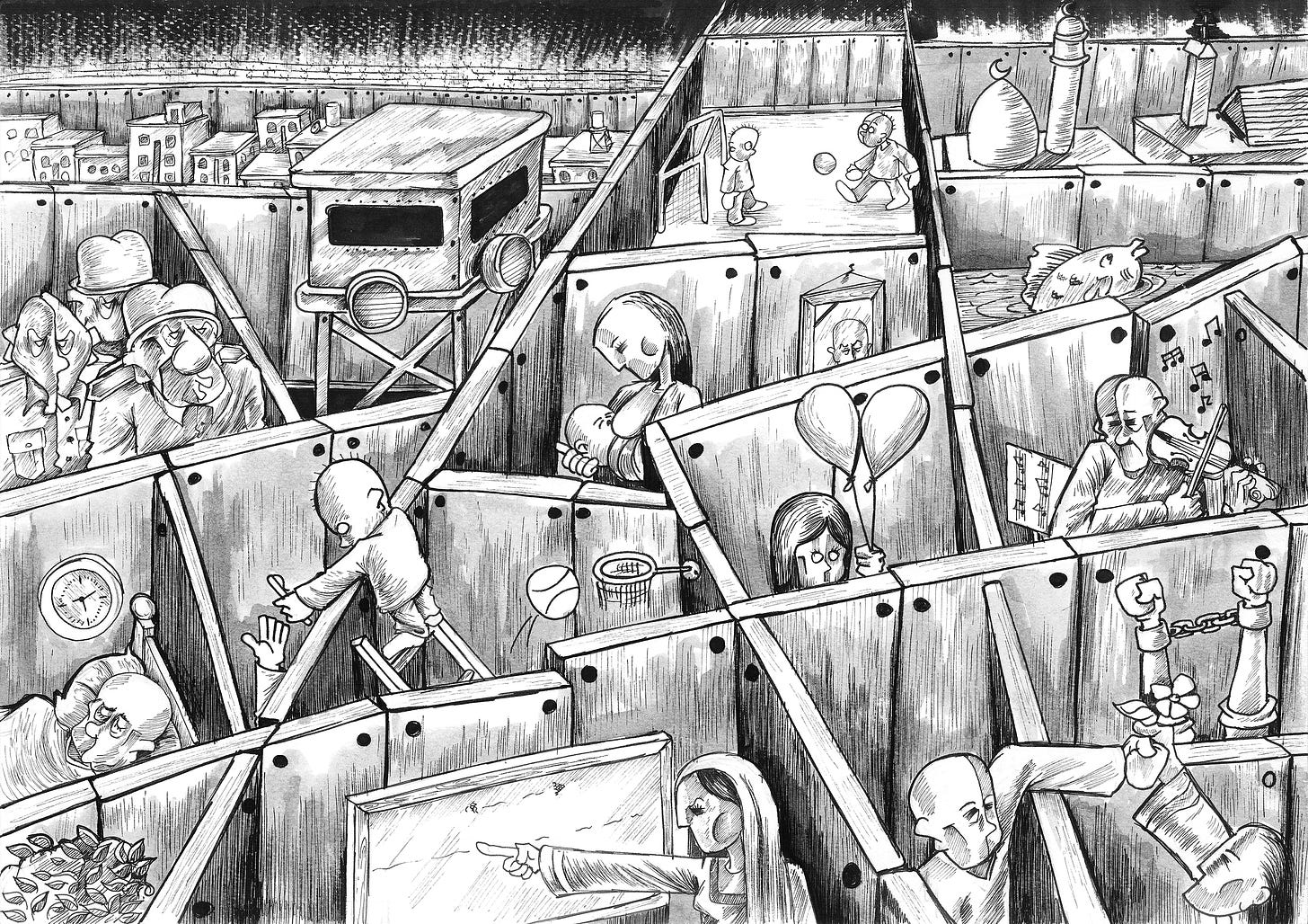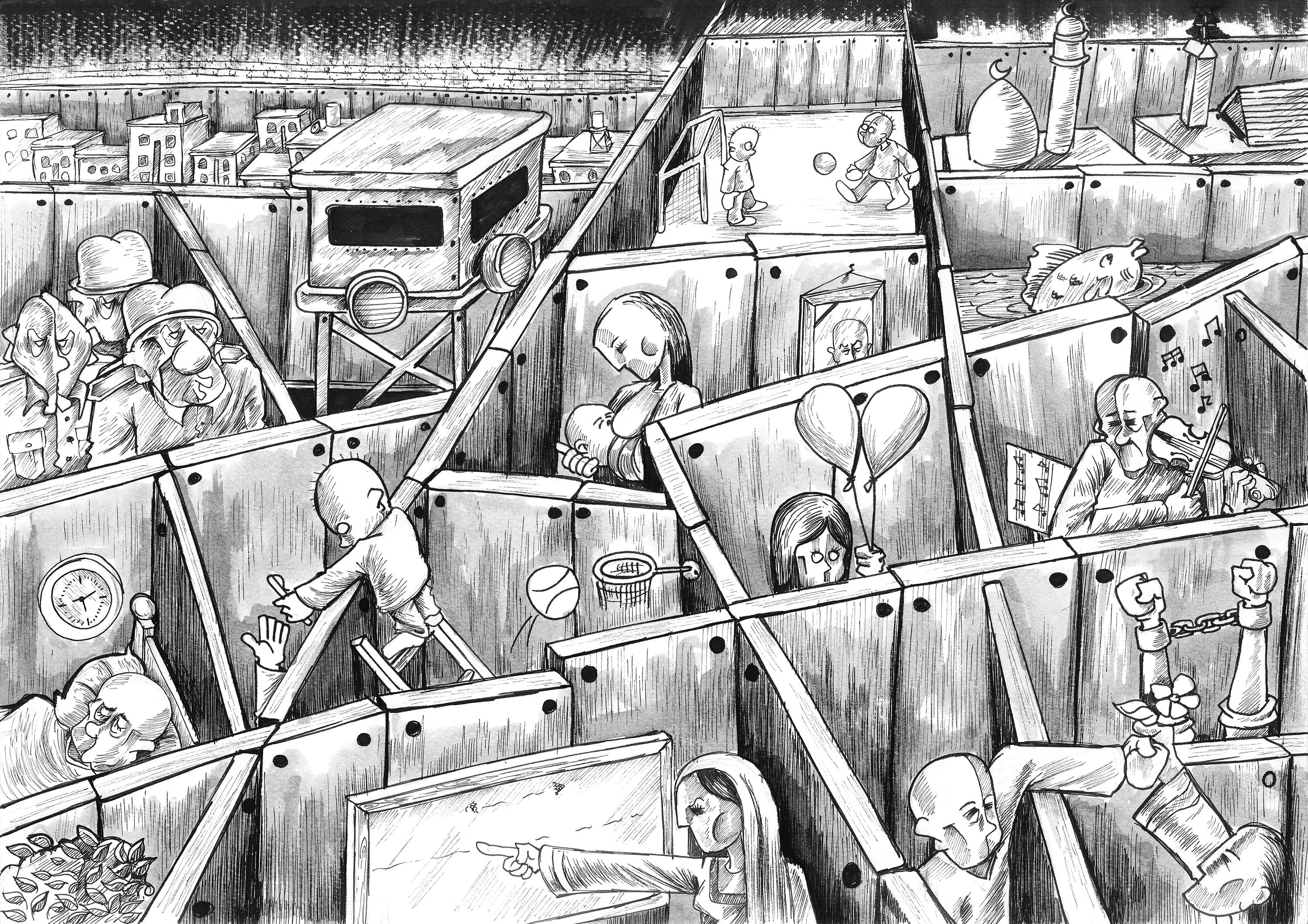Prisons take many forms in Sabaaneh’s work, where concrete walls tower over children playing football, barbed wire encloses communities, and tanks hold families at gunpoint.