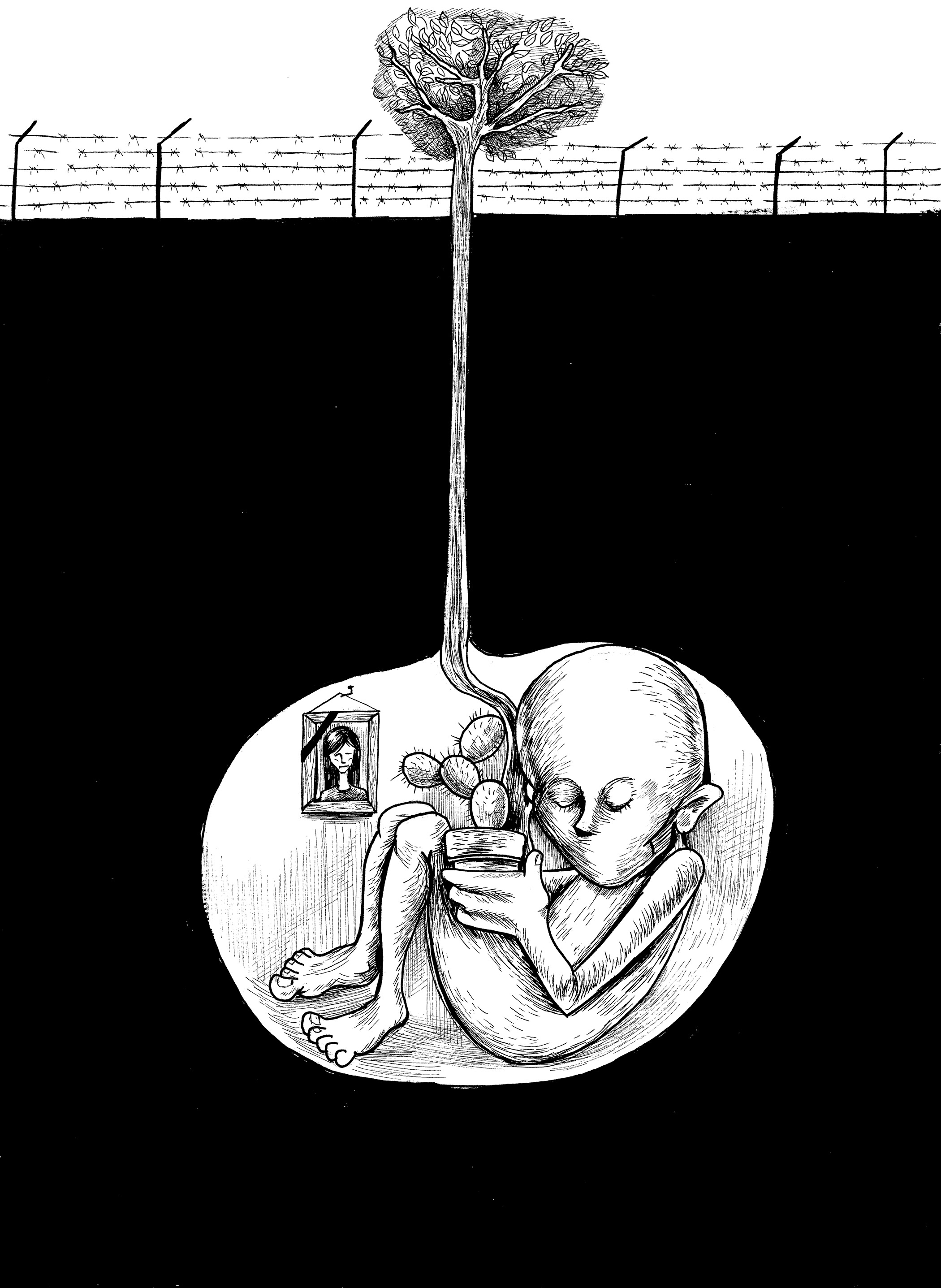 For those outside the orbit of Middle East media, Sabaaneh’s output offers a crash course in the symbols of suffering that articulate Palestinian reality. Gaunt, mouthless figures appear tethered and chained, trapped behind high fences and crushed beneath booted feet. Many are children denied the chance to flourish in a barren landscape where saplings are denied the opportunity to grow.