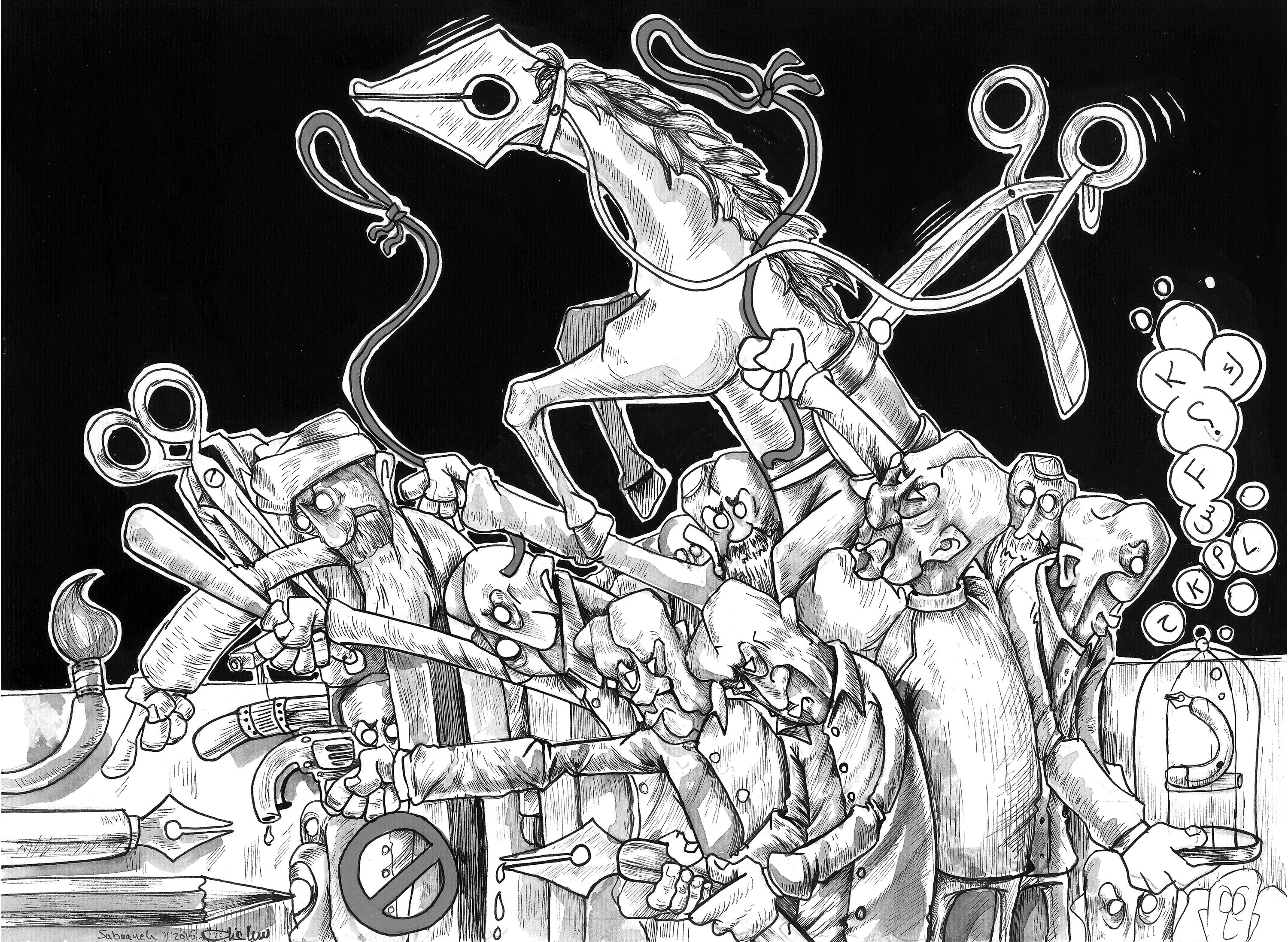Censorship is a recurrent theme in Sabaaneh’s cartoons. In one striking image, freedom of expression withers in a world where pens are bound and broken, not just in Palestine, but across the Arab world.